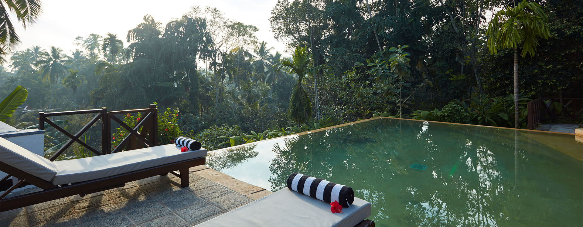 Wide pillared verandas, cool wraparound balconies, arched doorways and lofty beamed ceilings characterise this serene and restful Dutch-colonial style villa. The lush tropical garden surrounding the house is enlivened by visits from inquisitive monkeys high up in the trees.